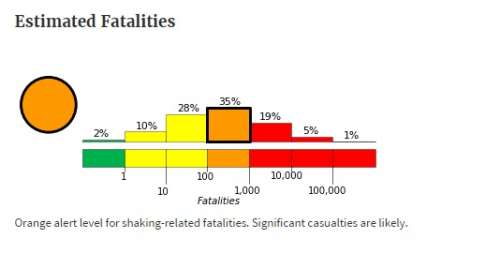 美國地質勘探局根據以往信息,就此次地震的人員傷亡預測發布橙色預警,認為最大的可能是最終死亡人數在100人到上千人之間。