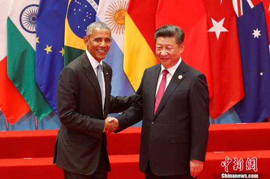 9月4日,二十國集團領(lǐng)導(dǎo)人第十一次峰會在杭州國際博覽中心舉行。 圖為習(xí)近平同美國總統(tǒng)奧巴馬握手。中新社記者盛佳鵬攝