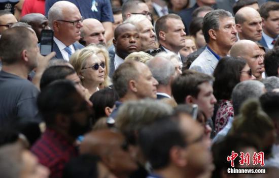 當(dāng)?shù)貢r(shí)間9月11日,“911”15周年紀(jì)念活動(dòng)在美國紐約911紀(jì)念公園舉行,圖為美國民主黨總統(tǒng)候選人希拉里出席當(dāng)天的紀(jì)念活動(dòng)。中新社記者 廖攀 攝