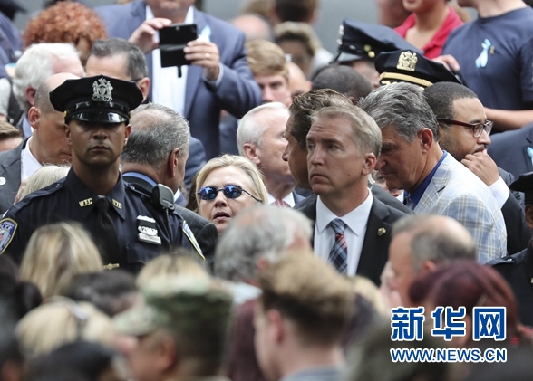 9月11日,在美國紐約,民主黨總統候選人希拉里·克林頓(中,戴墨鏡者)抵達活動現場。當天,“9·11”恐怖襲擊事件15周年紀念活動在美國紐約“9·11”紀念廣場舉行。 新華社記者王迎攝