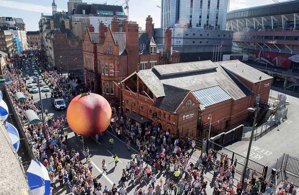 此次慶典活動最引人注目的是一個巨型的桃子,該巨桃模型出自羅爾德兒童小說《飛天巨桃歷險記》。高達9米多的巨桃模型穿城而過,男女老少爭先觀看,擁擠的人群洋溢著輕松快樂的氣息。與此同時,其它以該劇組家的作品人物為原型的慶;顒油瑯右步o人們帶來了巨大的驚喜和歡樂。