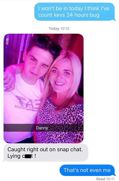 事情源于前一天晚上丹尼仍與朋友嬉戲玩耍,其中一名女子將他們的合照上傳至Snapchat社交網絡。意外的是,該女子正是老板的朋友,該照片正好被他的老板看到。照片中丹尼古怪滑稽,絲毫沒有生病的模樣,老板看到后當場將截圖發給丹尼,并直白地說道:“被當場抓住了吧!你個騙子。”