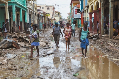 10月6日在,海地熱雷米村,民走在颶風過后積水的街道上。新華社發