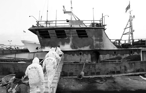 圖說:9月30日,韓方登船調查發生火災的中國漁船