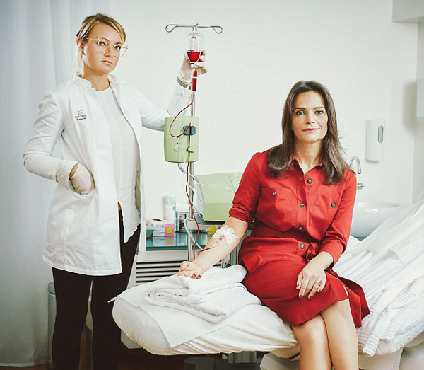 簡·弗萊爾(Jane Fryer)是其中一個接受臭氧療法的患者,據稱,她本人嚴重暈血,接受治療時十分忐忑,但想到這一切都是為了內在的美麗,為了讓血液循環重獲年輕,便覺得在所不惜。