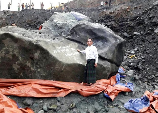 44歲的礦工紹敏(Sao Min)說:“發(fā)現(xiàn)這塊巨型寶石感覺像是中了彩票,但它是屬于國家的!碑(dāng)?shù)卣渭覅嵌ㄋ?U Tint Soe)也稱:“這塊玉原石有兩間小房子那么大,是上天賜給我們國家、政府和人民的一份禮物,是一個吉兆。”(實習(xí)編譯:任艷陽 審稿:朱盈庫)