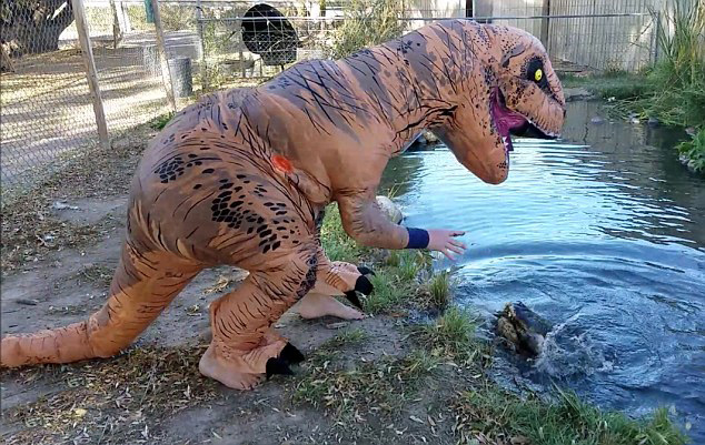 【環球網綜合報道】據英國《每日郵報》10月26日報道,在美國科羅拉多州的鱷魚爬行動物園,一名男管理員把自己打扮成“霸王龍”,手里還拿著一條魚戲弄水中大鱷魚,好在這條名為莫里斯(Morris)的鱷魚經過訓練,未對該男子造成傷害。