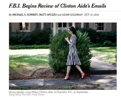 FBI開始篩查希拉里助手電郵。圖為今年9月,希拉里助手胡瑪·阿伯丁在北卡羅萊納州夏洛特。紐約時報網(wǎng)站截圖