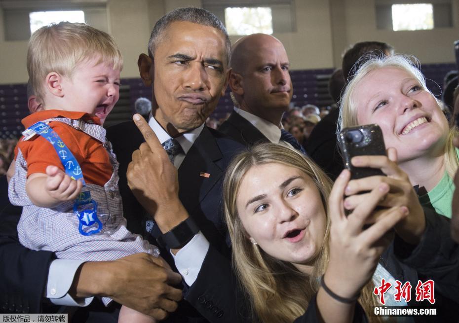當(dāng)?shù)貢r(shí)間2016年11月1日,美國(guó)俄亥俄州,總統(tǒng)奧巴馬舉行集會(huì)演講,為民主黨總統(tǒng)候選人希拉里拉票。現(xiàn)場(chǎng)的一名小朋友吸引了奧巴馬的注意,他再次展示了自己對(duì)于孩子的親和力,抱著萌娃嘟嘴和現(xiàn)場(chǎng)民眾合影,只是這名寶寶并不是太開心,在總統(tǒng)懷里放聲大哭。