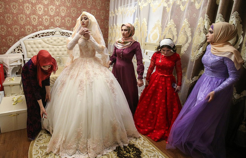 在整個婚禮過程中,新娘都需要站在指定位置,不能參加慶;顒,甚至不可以隨意說話或移動。在被介紹給新郎家屬的過程中,新娘需要保持謙卑,并為出席的客人奉上一杯水。而新郎通常不會在婚禮中露面,只有在儀式結束客人離開后,新郎新娘才能夠見面。在婚禮的第三天,伊斯蘭教士毛拉會在新郎家中主持傳統的車臣婚禮儀式。儀式上,新娘的叔叔會為新娘帶上戒指,而新郎會去注冊處登記。