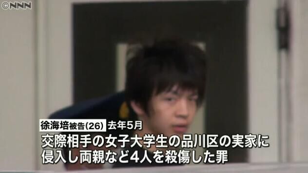 去年5月23日,被告人徐海培從陽臺闖入東京都品川區的女友所住公寓,用菜刀將該女子的繼父李容旻(韓籍,歿年47歲)捅死。之后又陸續將女子母親、趕來的女警和女子本人刺傷。