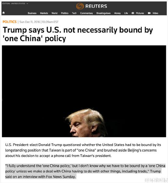 特朗普周日接受福克斯新聞采訪時說道:“我充分理解‘一個中國政策’,可除非我們與中國在包括貿易等其他方面有利益交換,我不懂我們為啥非要被這個政策限制住。”