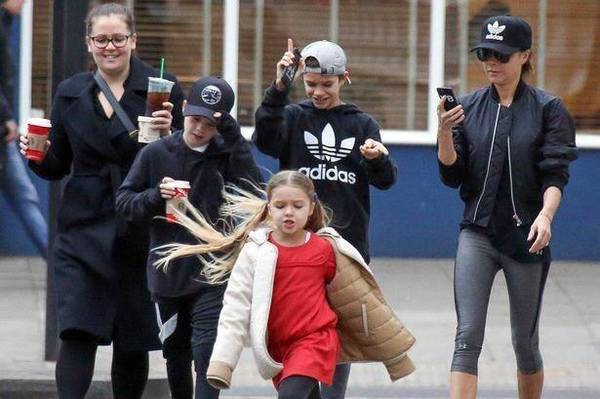 照片中一家四口打扮隨意,小七扎著兩條大長辮,身旁沒了老爸小貝和大哥布魯克林在,小七一路蹦蹦跳跳地跟著媽媽,能看出四個人特別開心,在過馬路的時候小七更是一副大姐范兒的走在眾人前面。