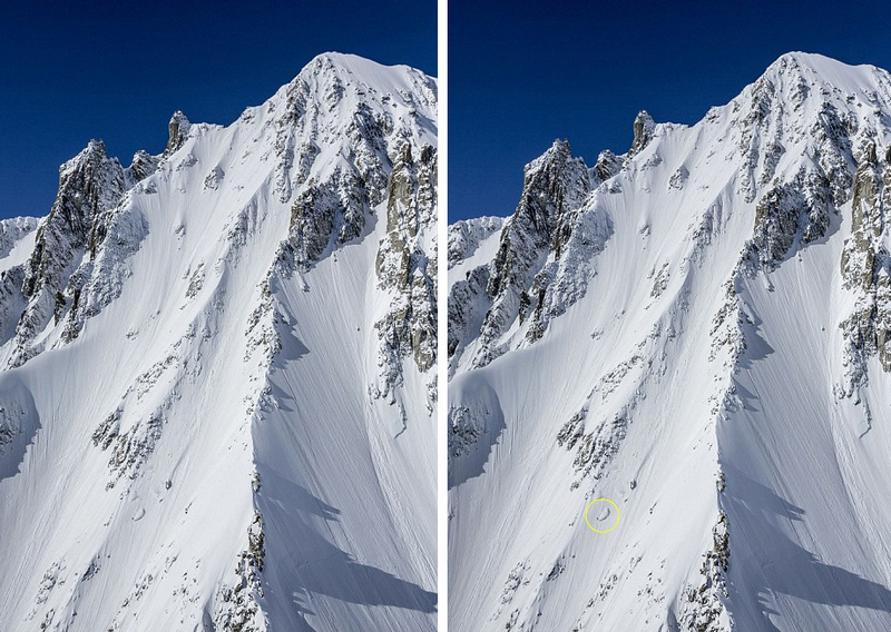 乍眼望去,這組圖片中只有白雪皚皚的山峰,但是仔細觀察,你會發現一個“膽大妄為”的人正從海拔3855米高的雪山上向下滑。28歲的法國滑雪愛好者員山姆(Sam Favret)在霞慕尼大若拉斯山近乎垂直的山峰上優雅地滑下,他的身影幾乎被雪淹沒。