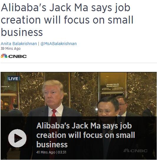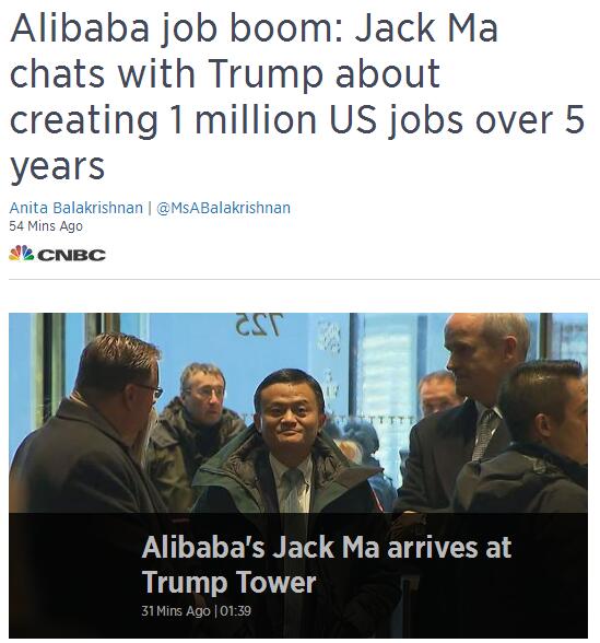 起初,CNBC援引消息人士的話稱,馬云此次會見特朗普,主要是聊阿里巴巴最新的美國擴張計劃。這份計劃包括未來5年在美國創(chuàng)造100萬就業(yè)崗位。CNBC顯然對此充滿期待,并將這個點當做標題。