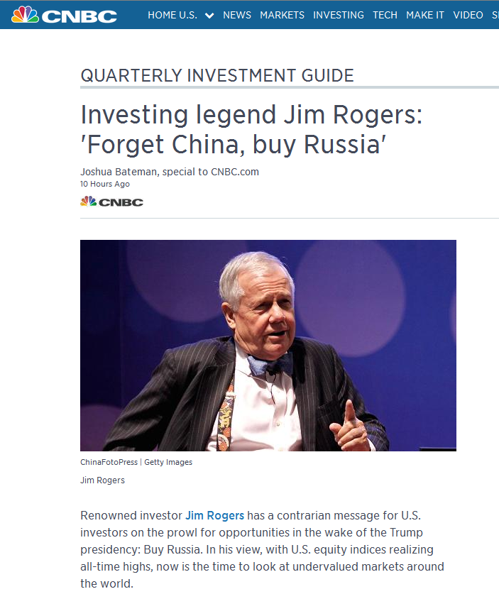 【環球網報道 記者 譚福榕】“忘掉中國,買俄羅斯吧!”這是美國CNBC關于美國投資大鱷吉姆·羅杰斯最新論斷的報道。羅杰斯在采訪中對特朗普時代的美俄關系回暖以及由此帶來的商機表示了樂觀,與此同時,他對特朗普的對華政策表達出擔憂。盡管CNBC的標題很聳動,羅杰斯卻非常清晰地傳遞出一個訊息:世界經濟的動力在亞洲,有些美國人還不明白。