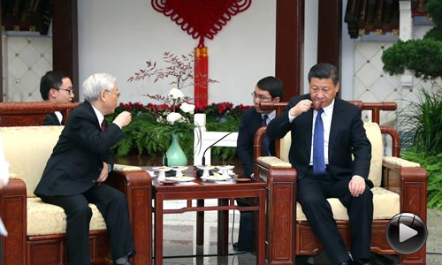 1月12日,中共中央總書記、國家主席習近平在人民大會堂同越共中央總書記阮富仲舉行會談,指出中越兩國都是共產黨領導的社會主義國家,是具有戰略意義的命運共同體。在兩黨兩國幾代領導人精心培育和大力推動下,中越兩國人民結下了“同志加兄弟”的友誼。會談后,兩黨總書記進行了茶敘,暢談中越共通的茶文化,共敘兩黨兩國關系未來。