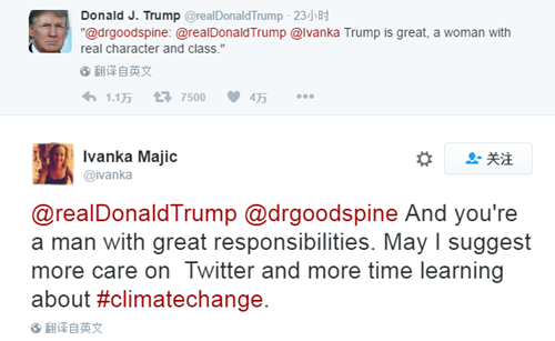 針對特朗普的“艾特(@)”,伊萬卡·馬吉克回復到:“@特朗普 您是一位肩負著很大責任的人,我建議您發(fā)推的時候還是小心點兒,而且多花些時間去關注一下全球氣候變化吧。”