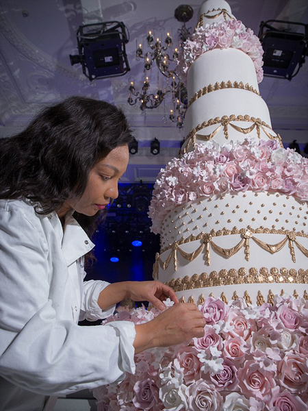 據悉,蛋糕設計師伊麗莎白·蘇拉瑞(Elizabeth Solaru)所使用的定制糖霜是用私人飛機從世界各地空運來的,耗費了1000多個鴨蛋。該蛋糕有香檳草莓、奶油蜜桃、西西里檸檬、紅絲絨和繽紛巧克力等5種口味。此款蛋糕原本有14層,代表婚禮在14日舉行。由于場地空間有限,蛋糕不得已被削減至10層,高達10英尺(約3米)。