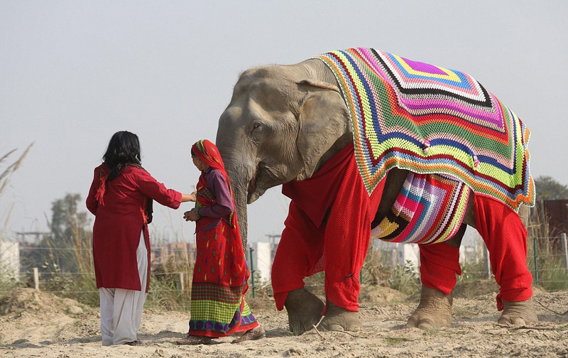 印度野生動物SOS大象保育中心以及馬圖拉救助中心附近村子的女性們為大象們編織過夜衣物,使它們免受寒冷夜晚的折磨。