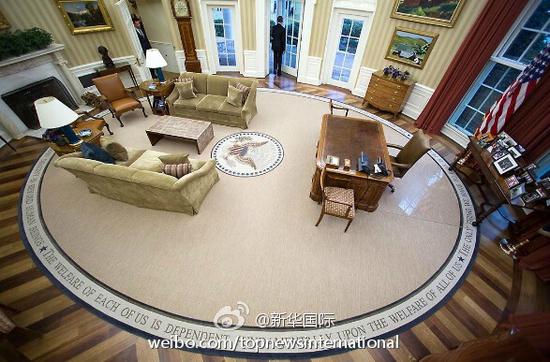 美聯社記者注意到,橢圓形辦公室從地板到天花板都發生了變化:奧巴馬時期選用的、邊緣印有5名美國歷史名人名言警句的地毯被撤換,取而代之的是一塊邊緣由花環點綴的金色地毯;窗簾同樣選取金色,替換了之前的深紅色窗簾;辦公室還換了一些新家具,但名為“堅毅桌”的總統辦公桌被沿用。