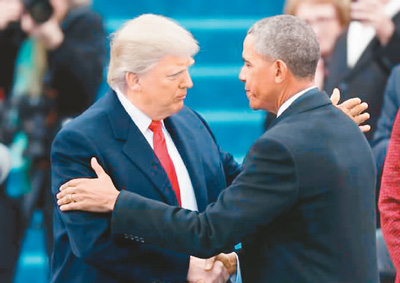 1月20日,在美國首都華盛頓國會(huì)山,特朗普(左)與奧巴馬在美國第45任總統(tǒng)就職典禮上握手。
