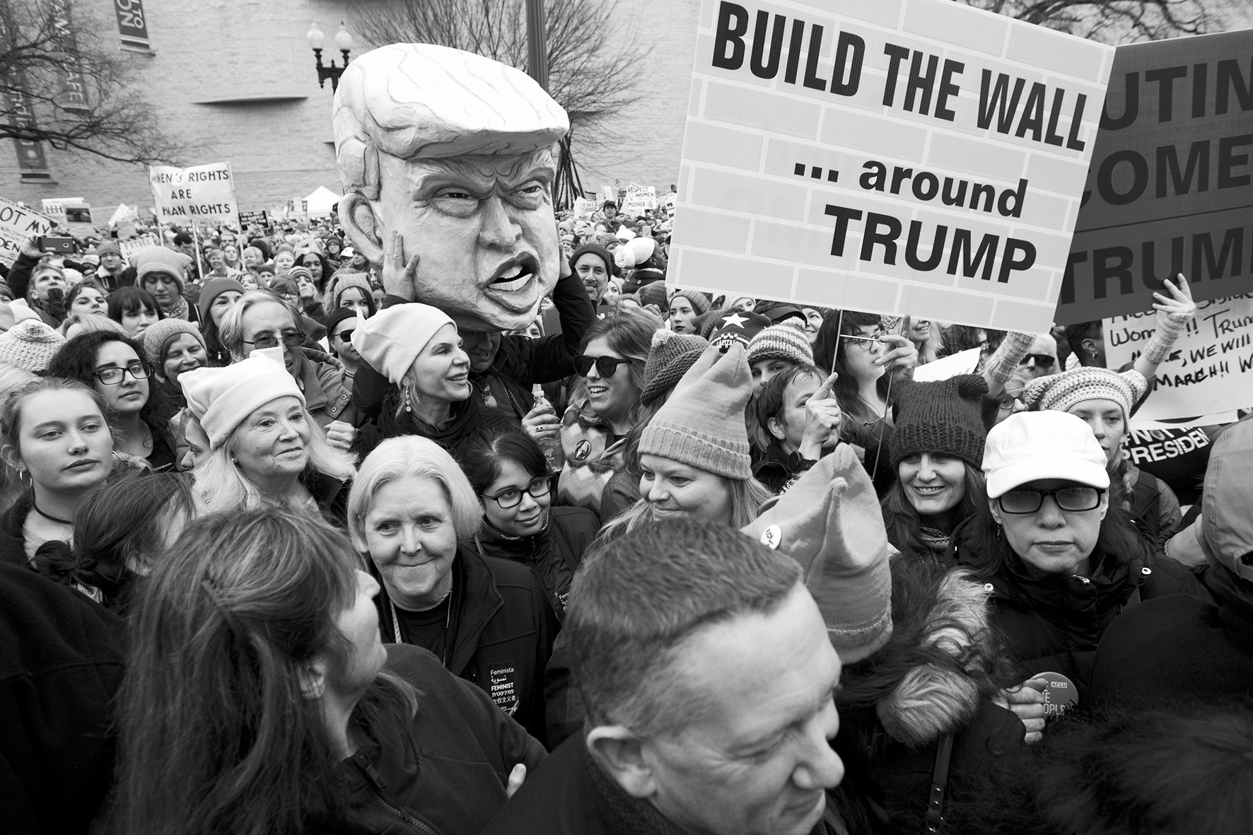 21日,數十萬人聚集在華盛頓參加女性大游行,圖中標語為“在特朗普周圍筑道墻吧”。