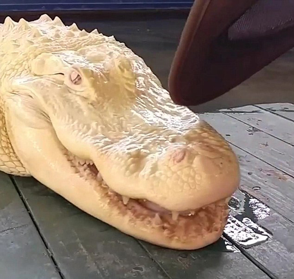 鱷魚佩爾長約2.3米,重約48千克,已經(jīng)10歲了,在鱷魚島主題公園已經(jīng)生活了7年。拍攝該視頻時,佩爾正好因為飼養(yǎng)員用帽子碰了它的鼻子調(diào)笑它而冒出水面,試圖奪回這頂帽子。它并沒有顯得無精打采,粉色的眼睛反倒讓人們難以看出它的視線在何方。