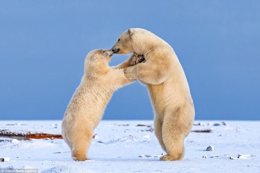 據(jù)英國《每日郵報》1月24日報道,近日,攝影師Shayne McGuire捕捉到了兩只小北極熊超有愛的一幕。這兩只小北極熊在等待母親捕食回來的時候,在雪地里手牽手仿佛跳起了華爾茲一樣,甚至還給了對方一個溫暖的吻。Shayne表示:“一般情況下是不會發(fā)生這樣的事情的。”