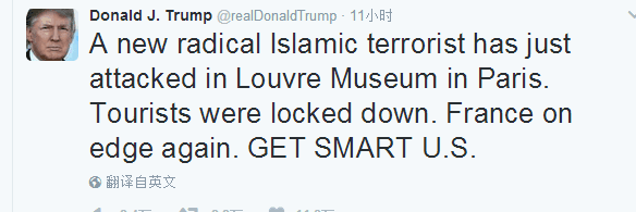 特朗普3日發(fā)表推文說:“一個(gè)新的激進(jìn)伊斯蘭恐怖分子剛剛在巴黎盧浮宮發(fā)動(dòng)攻擊。游客滯留當(dāng)?shù)亍7▏窒萑刖o張。美國,聰明點(diǎn)。”