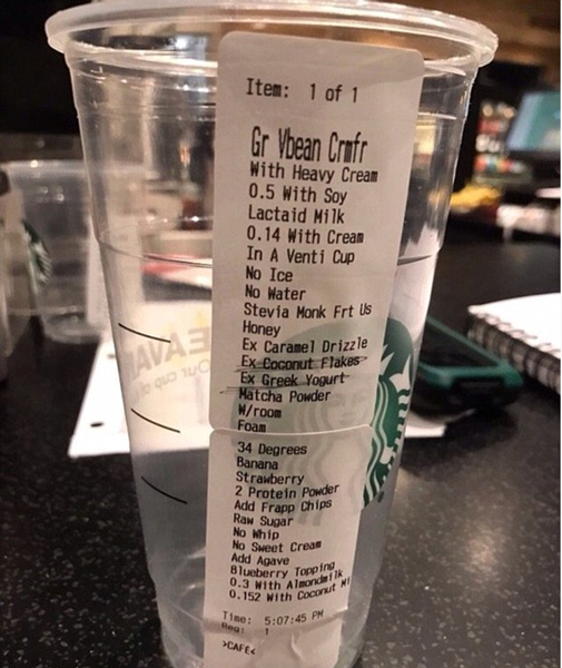【環球網綜合報道】據英國《每日郵報》2月13日報道,近日,在美國一家星巴克,一位顧客點了一杯做工極其復雜的香草星冰樂冰激凌,他特別要求定量添加19種不同的配料,溫度必須達到34度,僅一杯飲料就提出了27個要求,堪稱星巴克史上最復雜的點單。