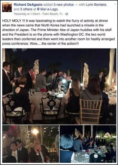 報道稱,名為“DeAgazio”的網友在其臉譜賬號上發布的照片顯示,一堆助手簇擁在特朗普和安倍身邊瀏覽文件,同時用手機作為手電筒打亮。這位網友寫道:“我的神!有新聞說朝鮮朝著日本方向發射了一枚導彈,在吃飯的時候看見這一幕(特朗普及其團隊的行為)真拉風。”之后,DeAgazio在其臉譜網頁上描述了兩位領導人“如何商討,然后進了另一個房間匆匆開了記者會。”