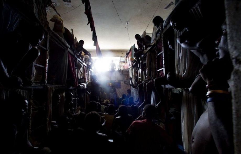 據英國《每日郵報》報道,近日,一組關于海地國家監獄的照片曝光,囚犯們在擁擠臟亂的國家監獄里生活,忍受著營養不良和傳染病的折磨,惡劣的環境已經導致海地監獄里的囚犯死亡人數急劇上升,僅上個月就有21名囚犯死亡。圖為囚犯們擠在陰暗狹小的牢房里看電視。電視是囚犯們自己湊錢買來的。
