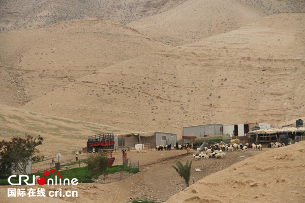 國際在線報道(中國國際廣播電臺記者 孫伶俐):從耶路撒冷到死海的公路兩邊幾乎都是荒漠,海拔逐漸降低,到了海拔為零的地方,公路邊有一個海平面路標,有貝都因人牽著駱駝在這里供游客拍照。而就在這旁邊的山坡上散落著一些極其簡陋的方形帳篷,有的是傳統的油氈布,也有的是鐵皮屋,但帳篷里面還是挺干凈的,有的地面上還鋪了鮮艷的地毯。這里住著巴以地區的游牧民族——貝都因人。