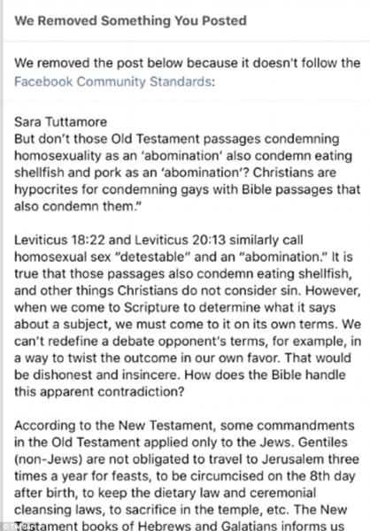 約翰斯頓太太在“臉譜”上有7.5萬名粉絲,他們的推送也常常被隱藏,帳號也常常被凍結,甚至有些人的主頁都被刪除了。她表示:“我們感到很沮喪,因為我們舉報一些色情內容或者人身威脅的內容時,‘臉譜’回應說這些內容不違反他們的論壇規約。但是基督教義中關于同性戀的陳述也不違反他們的論壇規約,他們就是在監視信奉基督教的用戶。”