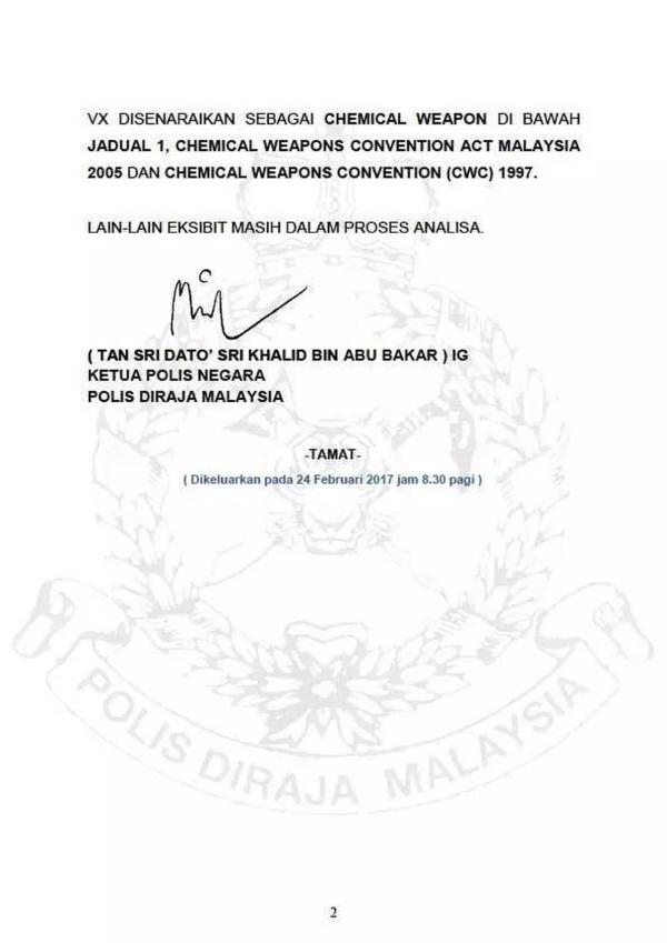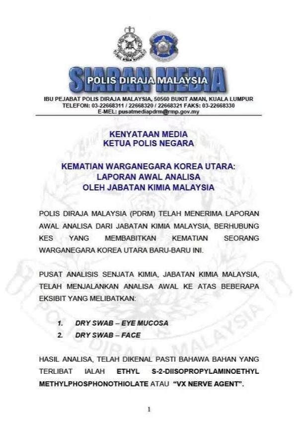 今天上午,馬來西亞警方發表聲明稱,警方已收到初步的尸檢報告,通過對死者眼粘膜和臉部樣本分析,檢測出了一種叫VX的神經毒劑成分。
