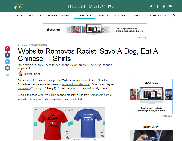 《赫芬頓郵報》稱,寫有一些獵奇或好玩字眼的文化衫、T恤衫在世界各地不是什么新鮮事,但也有人把一些帶有種族歧視性質(zhì)的內(nèi)容印上去。讓用戶自己設(shè)計和銷售定制服裝是Spreadshirt的一種營銷模式。北美華裔社區(qū)一家網(wǎng)站發(fā)現(xiàn),3月初,Spreadshirt的兩個用戶定制了帶有冒犯中國人內(nèi)容的T恤,其中一款T恤寫有“救一只狗,吃一個中國人”,另一款寫有“救一條鯊魚,吃一個中國人”。盡管這兩款T恤并不是由Spreadshirt設(shè)計,但還是有相當(dāng)多的人對該公司允許銷售此類產(chǎn)品感到失望。