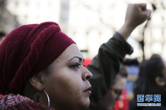 3月8日,在美國紐約曼哈頓舉行的“沒有女性的一天”婦女節(jié)集會(huì)上,一名參與者在聽演講時(shí)落淚。
