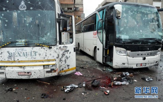 這是3月11日在敘利亞首都大馬士革拍攝的爆炸襲擊后的場景。敘利亞安全部門11日說,首都大馬士革當天發生兩起爆炸襲擊,造成至少40人死亡、100多人受傷。 (阿馬爾攝)