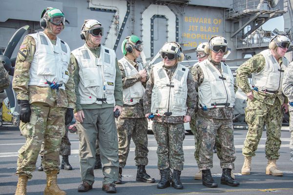 韓聯合參謀本部議長李淳鎮(左四)和美韓聯合司令部司令布魯克斯(左一)登上“卡爾·文森”號航母。