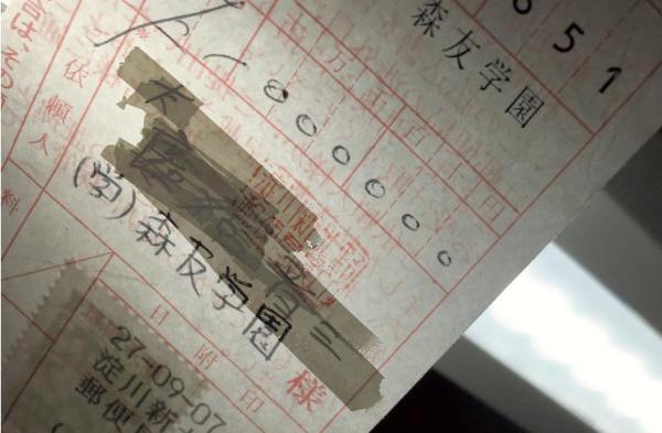 《每日新聞》18日公開了這張收據(jù)。匯款單上匯款金額為100萬日元,匯款人一欄被修正貼改過后寫著森友學(xué)園,但透過修正貼可以看見后面的“安倍晉三”四個字。修改處蓋有當(dāng)時處理這筆匯款業(yè)務(wù)的郵局印章。