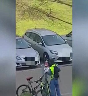 小偷被發現在停車場內切下標桿的指示牌從而方便舉起自行車擰開車鎖,但他并不知道自己已被車主兼工作人員拍下。當安保人員試圖抓住自行車手把以防小偷帶走山地自行車時,蒙面暴徒揮著斧頭向他撲去,似乎在進行威脅。另一人準備接近小偷時,同樣也被其恐嚇。