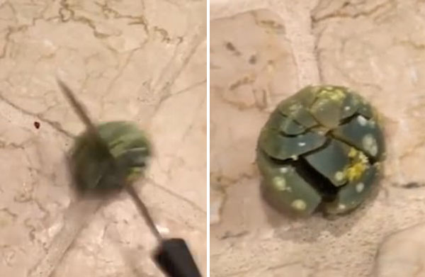 這枚色彩繽紛的雞蛋在9年前復活節的“尋找彩蛋”游戲中被遺忘在沙發坐墊下,直至今天才被發現。在這段令人反胃的視頻中,在Reddit McReddit搖了搖雞蛋后,能聽到有東西在里面翻滾,他說道“里面已經變成一個皮球了。”繼而用刀敲開9歲的雞蛋殼,露出里面一個奇形怪狀、腐爛的腫塊。