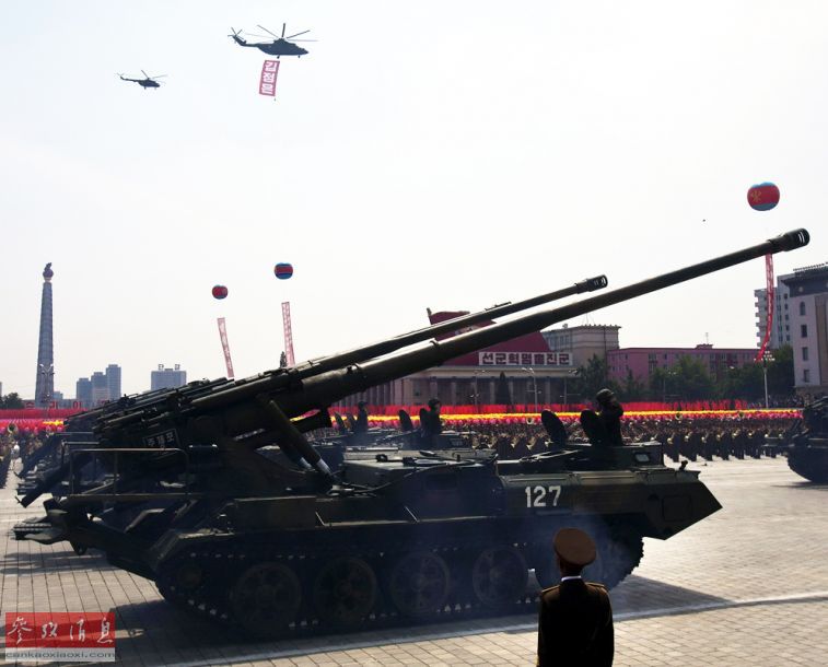 4月15日,朝鮮人民軍在首都平壤舉行了盛大閱兵式,展出了多種新型武器裝備。M1989式170毫米“谷山大炮”方隊,一架米-26重型直升機正從上空飛過。