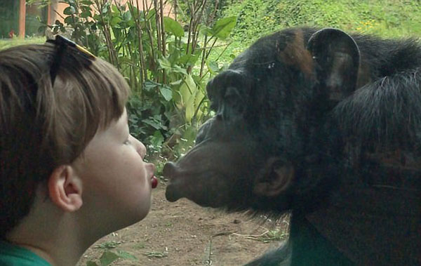 當時,諾蘭坐在圈養大猩猩的圍欄外面,試圖隔著玻璃窗戶和大猩猩玩躲貓貓。但他注意到大猩猩似乎對這一游戲并不感興趣,于是便將小嘴緊緊地貼在玻璃窗上。這時,出現了暖心的一幕,只見圍欄內的這只大猩猩也將自己的嘴巴貼在了玻璃窗上回吻著諾蘭。這下他倆可玩嗨了:每當諾蘭在玻璃窗上親吻一下時,大猩猩也會在玻璃窗上回吻一下。