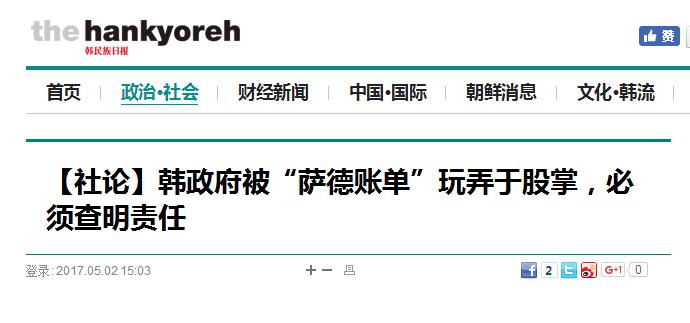 【環(huán)球網(wǎng)綜合報(bào)道】日前,美韓圍繞著部署“薩德”的費(fèi)用互相指責(zé),令世界“大跌眼鏡”。對(duì)此,韓國(guó)《韓民族日?qǐng)?bào)》5月2日發(fā)表題為“韓政府被‘薩德賬單’玩弄于股掌,必須查明責(zé)任”的社論稱,韓國(guó)在挨了美國(guó)背后一擊后,依然被美國(guó)牽著鼻子,未能作出妥善反應(yīng),只能苦苦掙扎...韓國(guó)政府竟然淪落到如此令人恥笑的地步,使人不禁感到憤慨!凹热皇虑橐呀(jīng)發(fā)展至此,韓國(guó)就應(yīng)該展開(kāi)國(guó)政調(diào)查,查明薩德部署過(guò)程的詳細(xì)始末,切實(shí)追究責(zé)任”。