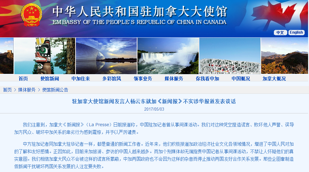 我們注意到,加拿大《新聞報》(La Presse)日前報道稱,中國駐加記者曾從事間諜活動。我們對這種憑空捏造謊言、敗壞他人聲譽(yù)、誤導(dǎo)加方民眾、破壞中加關(guān)系的卑劣行為感到震驚,并予以嚴(yán)厲譴責(zé)。