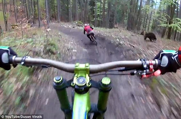 這一驚險(xiǎn)時(shí)刻由另一位山地車騎手頭盔上的攝像機(jī)記錄了下來。從視頻中可以發(fā)現(xiàn),這只大黑熊在轉(zhuǎn)身走向樹林中后,再次出現(xiàn)了,它正對(duì)著杜桑大吼。