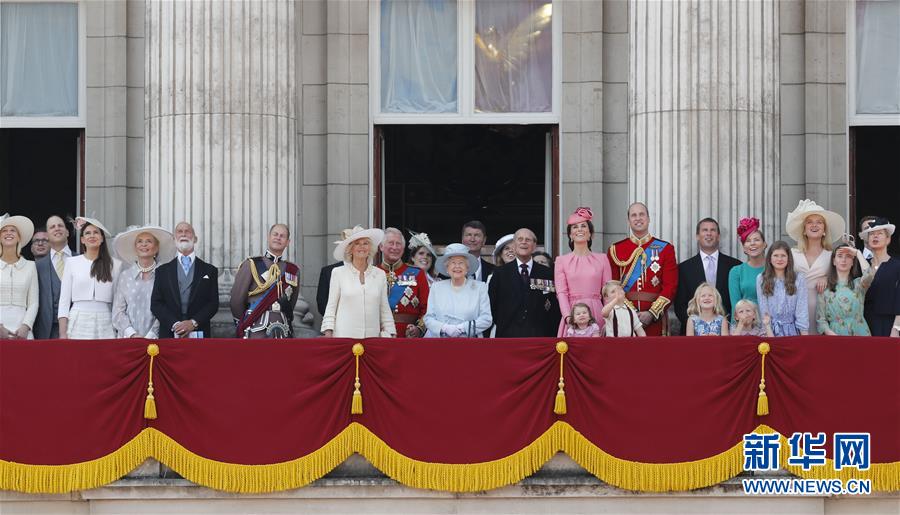 6月17日,在英國倫敦,英女王伊麗莎白二世(中)在白金漢宮陽臺上觀看飛行表演。當日,英國倫敦舉行盛大生日慶典,慶祝英女王91歲官方生日。新華社記者 韓巖 攝