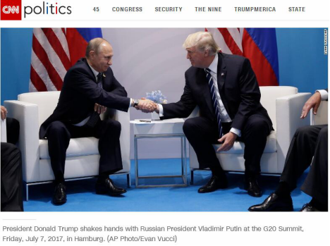 在G20漢堡峰會上,媒體多次捕捉到特朗普和普京“惺惺相惜”的畫面。7日早上,兩人首次碰面,互相握手致意并坐在同一張桌旁,等待會議開始;英國《每日電訊報》還拍到特朗普在會場上輕拍普京的后背,以示親熱的場景。